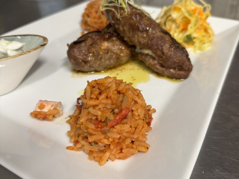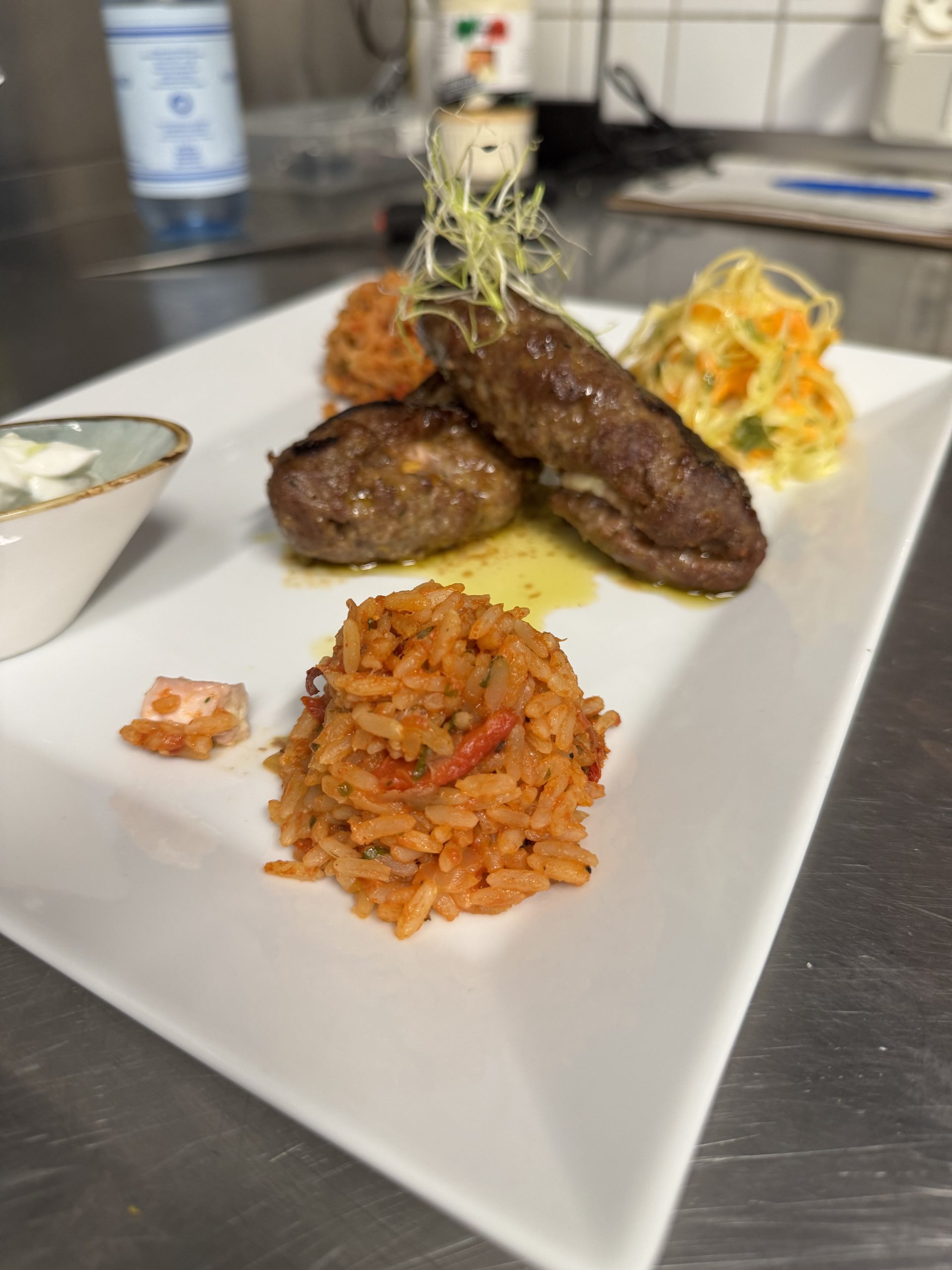 Unser Bifteki ist eine wahre Handwerkskunst der griechischen Küche. Nach traditioneller Art formen wir aus bestem Rinderhackfleisch, aromatischen Kräutern und unserer speziellen Gewürzmischung saftige Steaks, die wir mit würzigem Schafskäse füllen. Auf dem Grill perfekt gegart, entwickelt das Bifteki seine unverwechselbare Geschmackskombination – knusprig von außen, saftig von innen und mit einem cremig-würzigen Käsekern, der auf der Zunge zergeht.